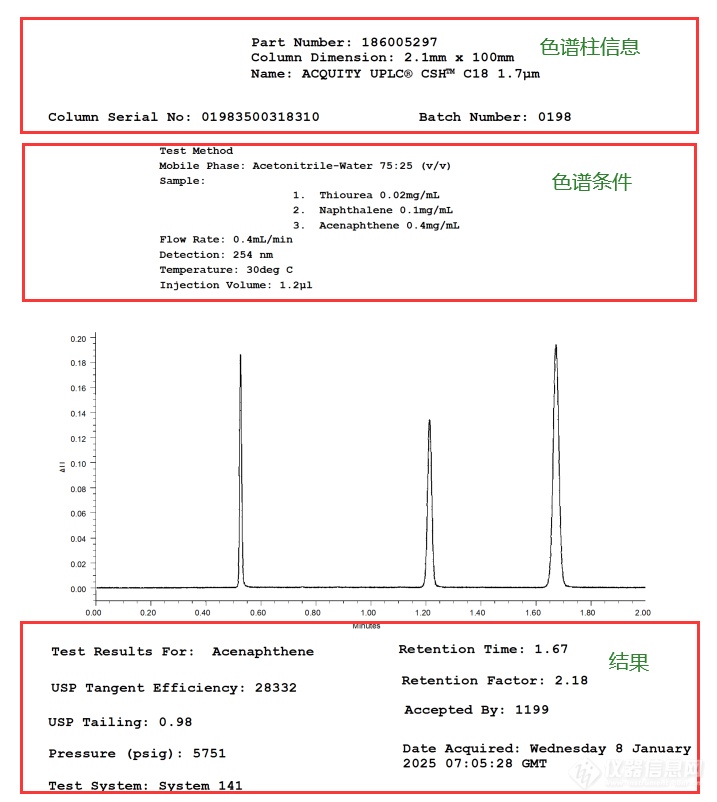 ACQUlTY UPLC BEH C 18, l.7 μm, 2.1 mm X 50 mm (PN 186002350)測試二氫苊